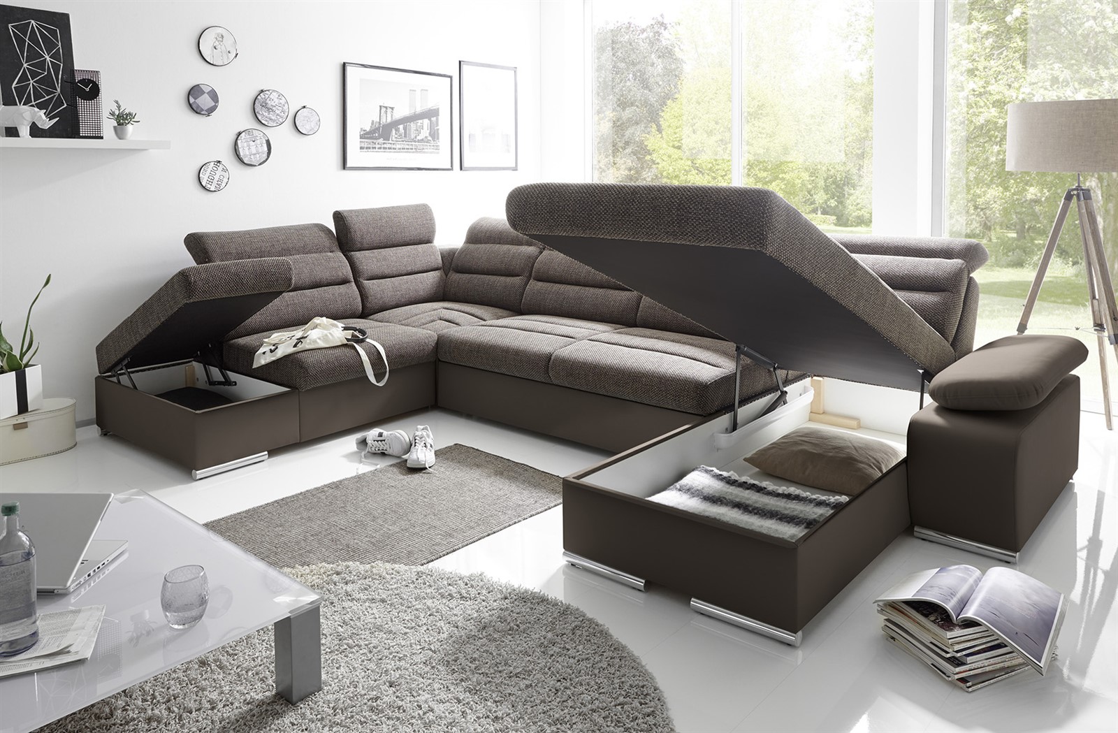 Couchgarnitur PASCARA U-Form mit Schlaffunktion-Braun /Ottomane Rechts
