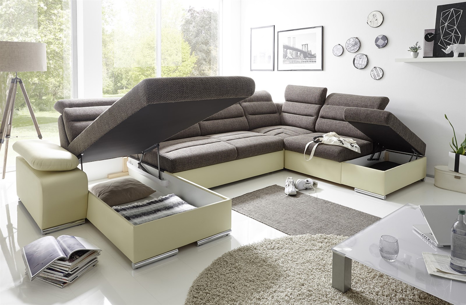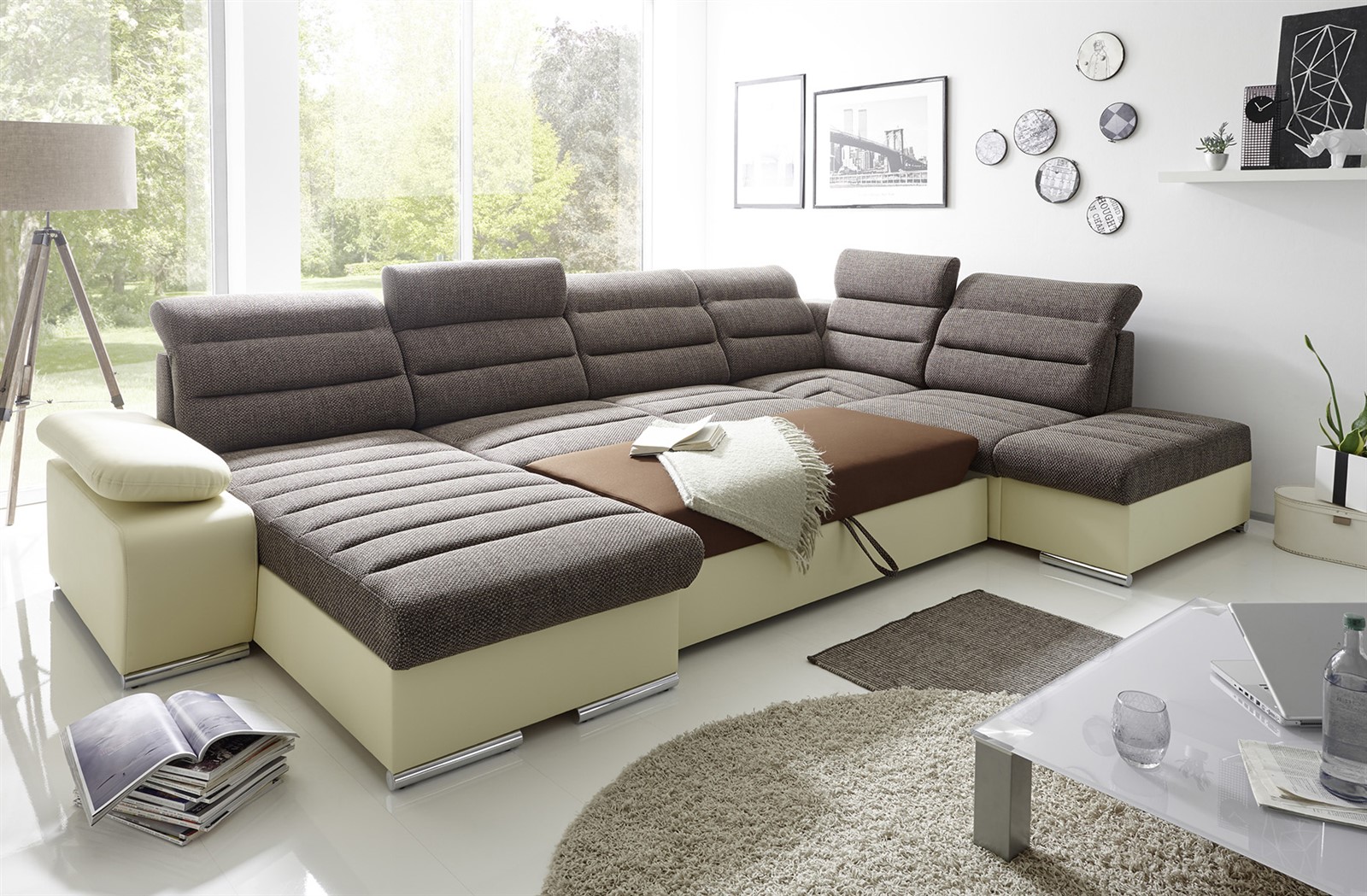 Couchgarnitur PASCARA U-Form mit Schlaffunktion-Creme /Ottomane Links