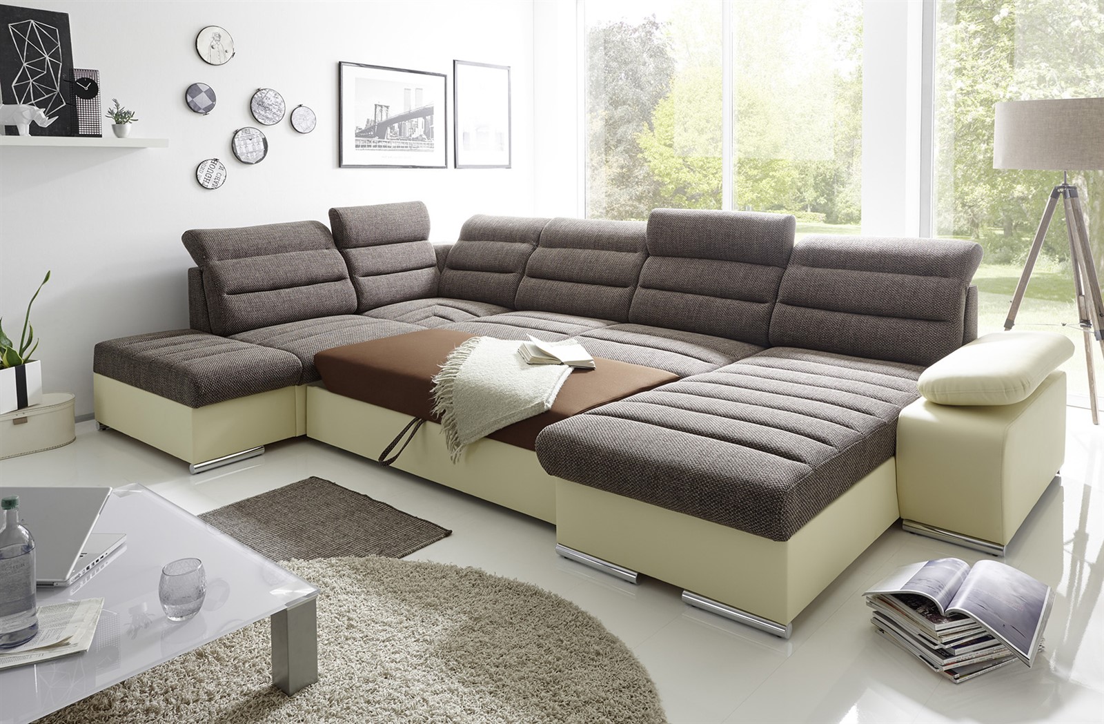 Couchgarnitur PASCARA U-Form mit Schlaffunktion-Creme /Ottomane Rechts