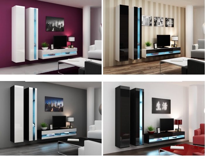 Mediawand Wohnwand 3 tlg - SENTIC 5 - Schwarz / Weiss Hochglanz