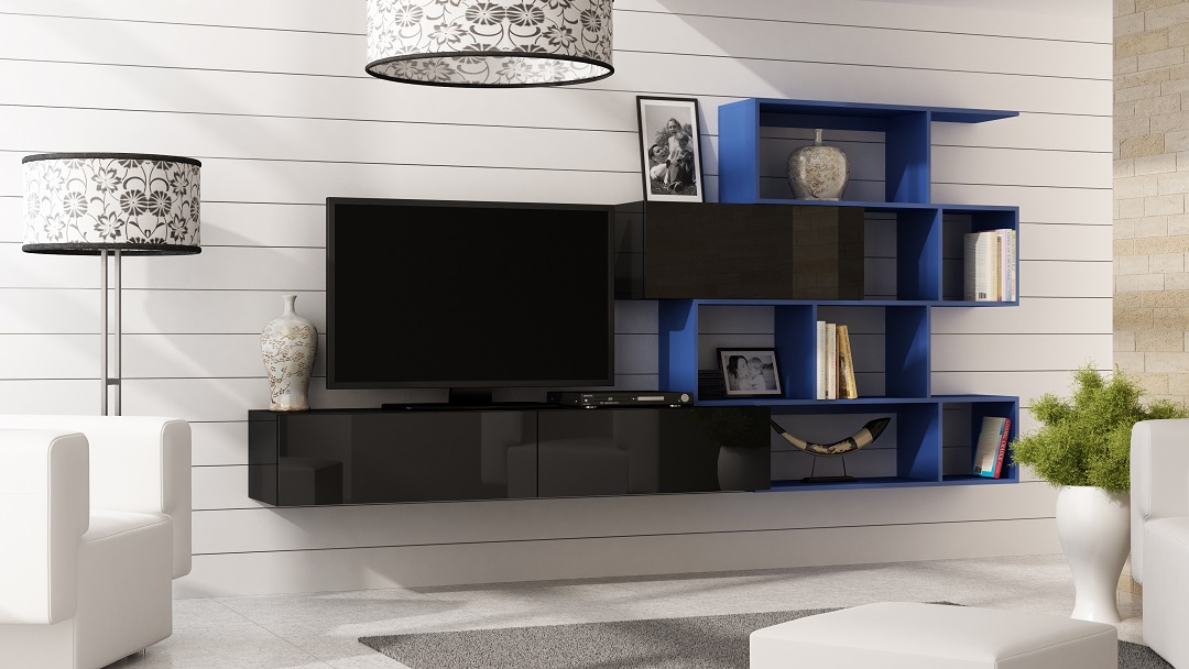 - 1 x Mediawand - SKY - Schwarz Hochglanz / Regal: Blau