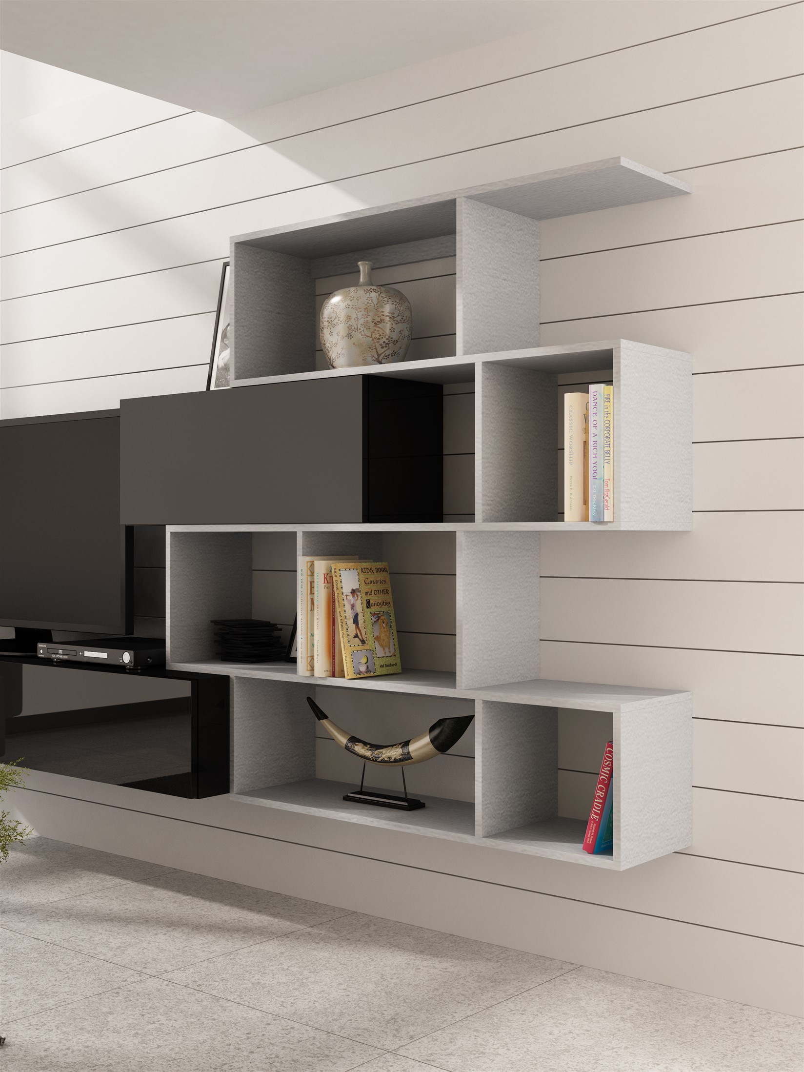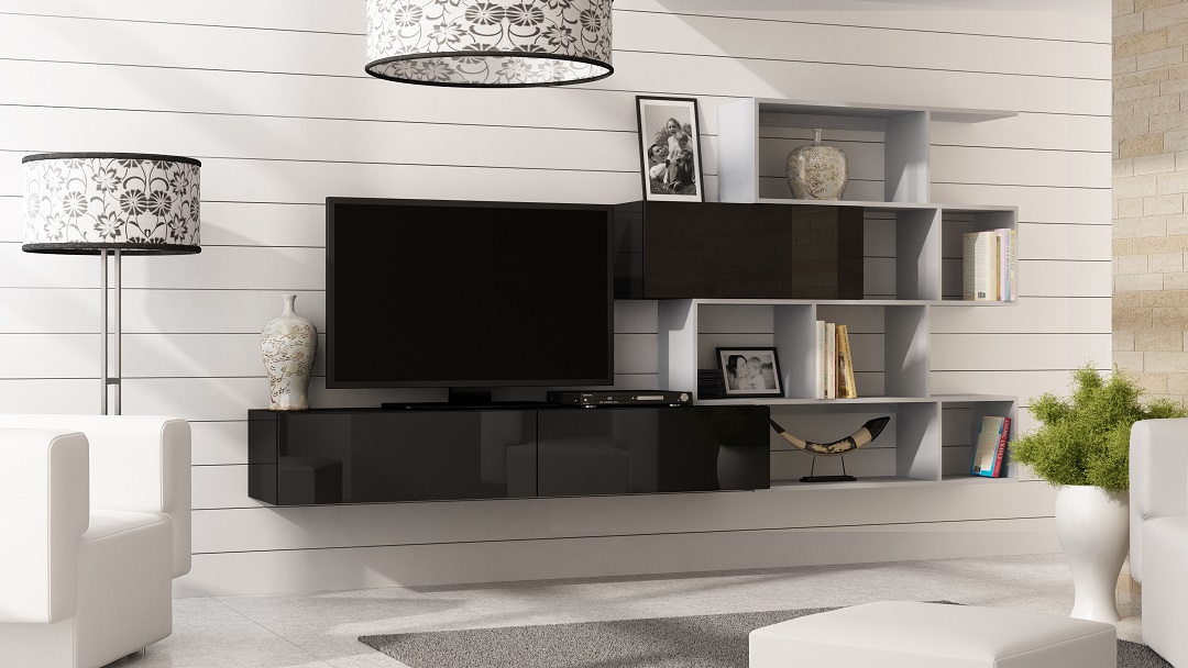 - 1 x Mediawand - SKY - Schwarz Hochglanz / Regal: Grau