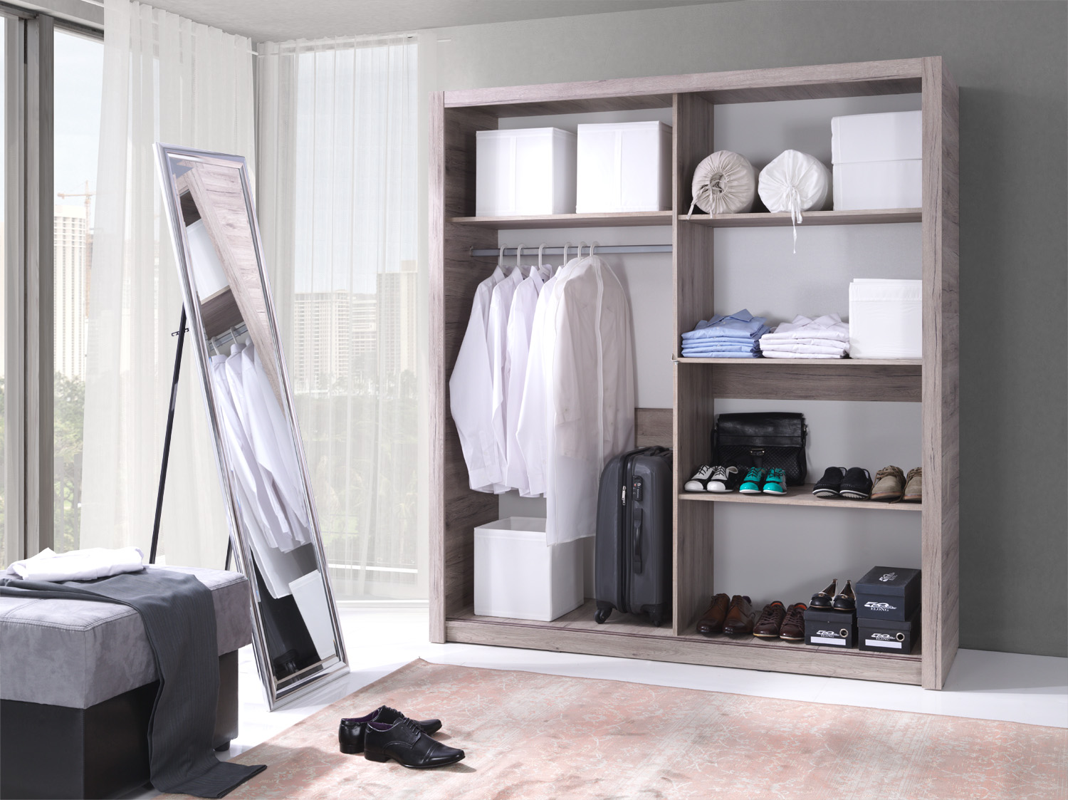 Hinter den zwei großen Schwebetüren befinden sich zwei Einteilungen. In diesen Elementen können Sie allerhand Klamotten verstauen.