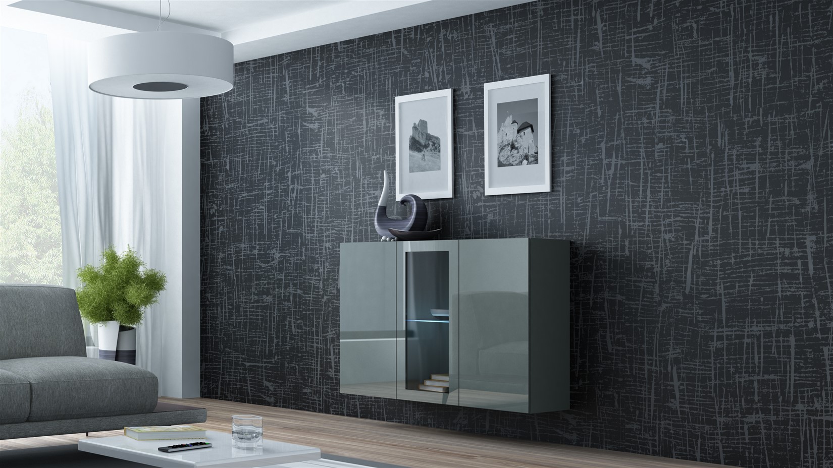- 1 x Hängesideboard - LUGO - Grau matt / Grau Hochglanz